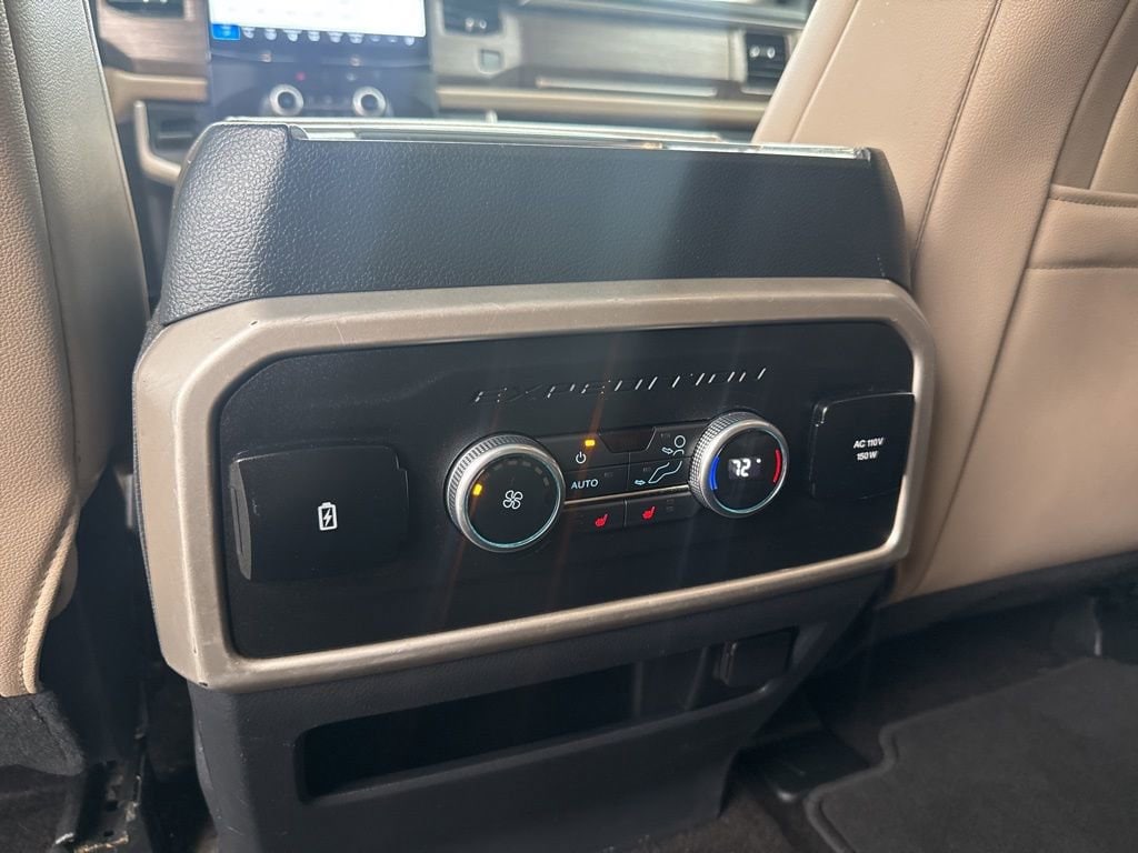 This 2022 Ford Expedition Max Limited in Black Metallic comes with the following features: EcoBoost 3.5L V6 GTDi DOHC 24V Twin Turbocharged 10-Speed Automatic RWD Equipment Group 301A Mid Package, 12 Speakers, 2nd Row Power-Folding 40/20/40 Leather Bench Seat, 3.31 Axle Ratio, 3rd row seats: split-bench, 4-Wheel Disc Brakes, ABS brakes, Active Park Assist 2.0, Adjustable pedals, Air Conditioning, Alloy wheels, AM/FM radio: SiriusXM with 360L, Auto High-beam Headlights, Auto Start-Stop Removal, Auto-dimming door mirrors, Auto-dimming Rear-View mirror, Automatic temperature control, Brake assist, Bumpers: body-color, Compass, Delay-off headlights, Driver door bin, Driver vanity mirror, Dual front impact airbags, Dual front side impact airbags, Electronic Stability Control, Emergency communication system: SYNC 4 911 Assist, Exterior Parking Camera Rear, Four wheel independent suspension, Front anti-roll bar, Front Bucket Seats, Front Center Armrest, Front dual zone A/C, Front fog lights, Front License Plate Bracket, Front reading lights, Fully automatic headlights, Garage door transmitter, Heated & Ventilated Leather Front Captain's Chairs, Heated door mirrors, Heated front seats, Heated rear seats, Heated steering wheel, Illuminated entry, Leather steering wheel, Low tire pressure warning, Memory seat, Navigation system: Connected Navigation, Occupant sensing airbag, Outside temperature display, Overhead airbag, Overhead console, Panic alarm, Passenger door bin, Passenger vanity mirror, Pedal memory, Power door mirrors, Power driver seat, Power Liftgate, Power moonroof, Power passenger seat, Power steering, Power windows, Radio data system, Radio: B&O Sound System by Bang & Olufsen, Rain sensing wipers, Rear air conditioning, Rear anti-roll bar, Rear reading lights, Rear window defroster, Rear window wiper, Reclining 3rd row seat, Remote keyless entry, Security system, SiriusXM w/360L, Speed control, Speed-sensing steering, Speed-Sensitive Wipers, Split folding rear seat, Spoiler, Steering wheel memory, Steering wheel mounted audio controls, SYNC 4 w/Enhanced Voice Recognition, Tachometer, Telescoping steering wheel, Tilt steering wheel, Traction control, Trip computer, Turn signal indicator mirrors, Variably intermittent wipers, Ventilated front seats, Voltmeter, and Wheels: 20 Bright Machined Aluminum.